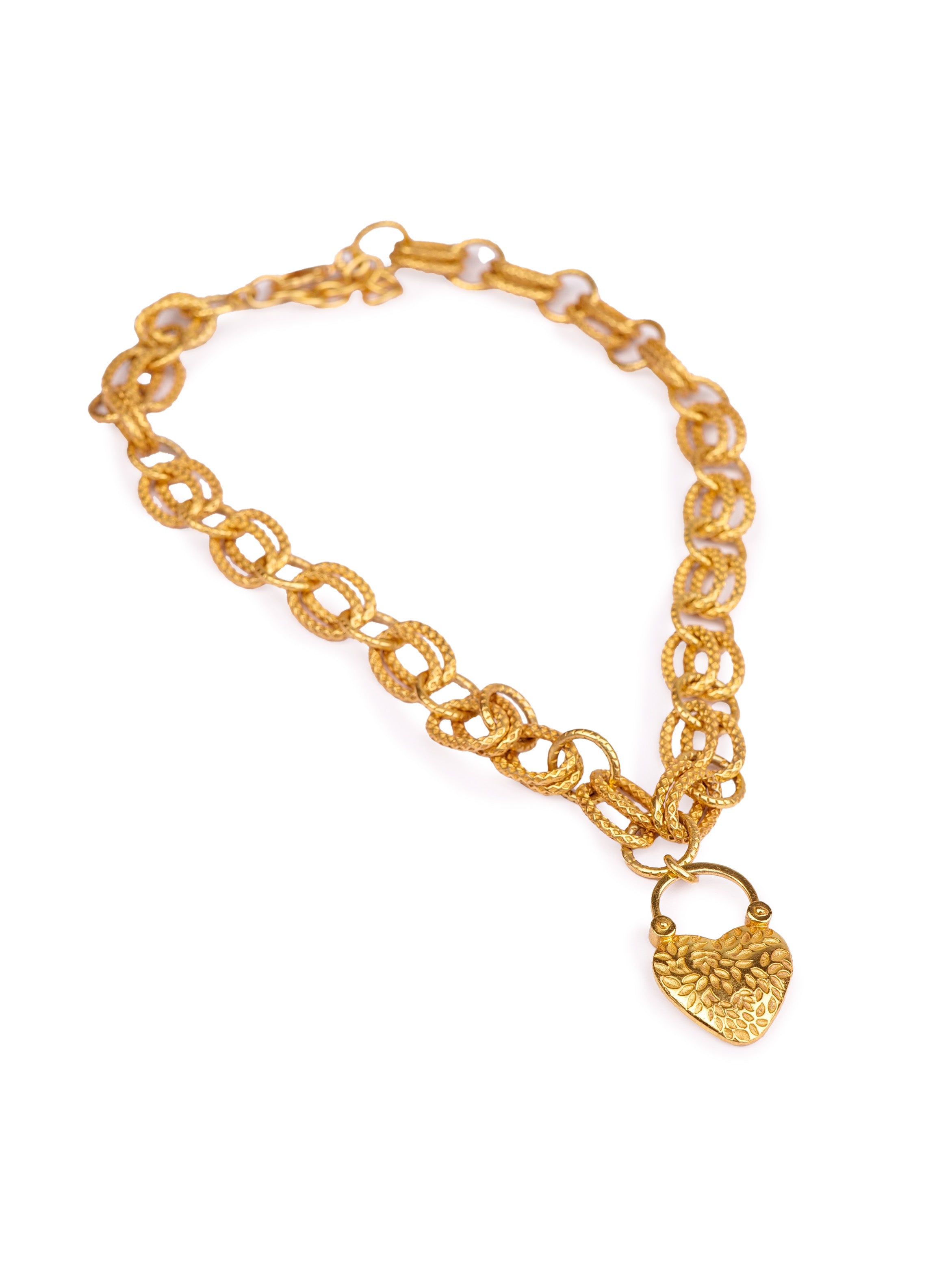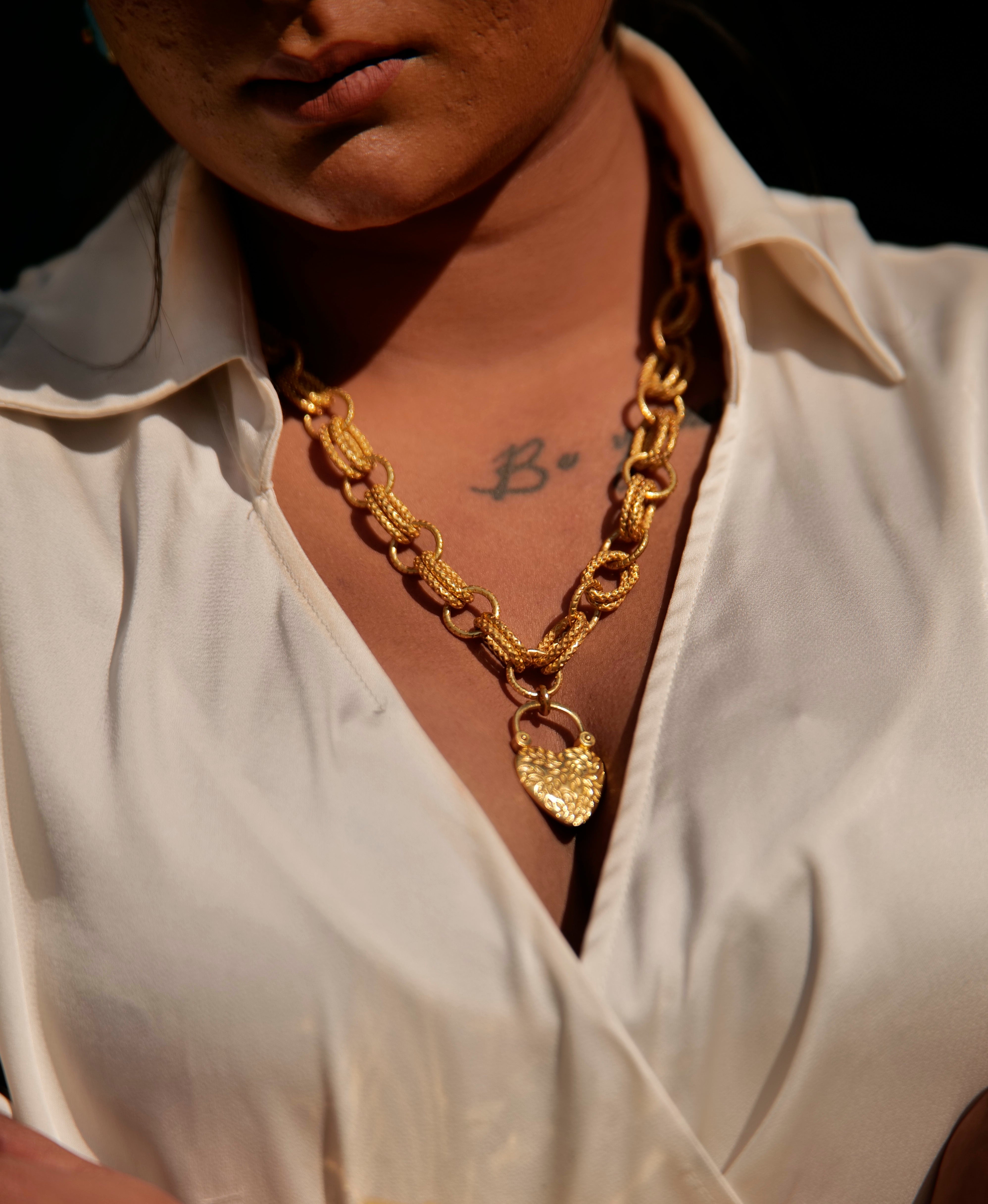 The Estelle Chain channels vintage character through its 24 karat gold-plated finish and sculptural detailing. The interlinked rope style chain adds texture and depth, while the heart-shaped pendant with a raised leaf pattern brings a touch of romance and craftsmanship. It’s a bold yet versatile piece that stands out on its own or layers effortlessly with other chains for a more contemporary edge.