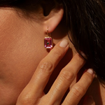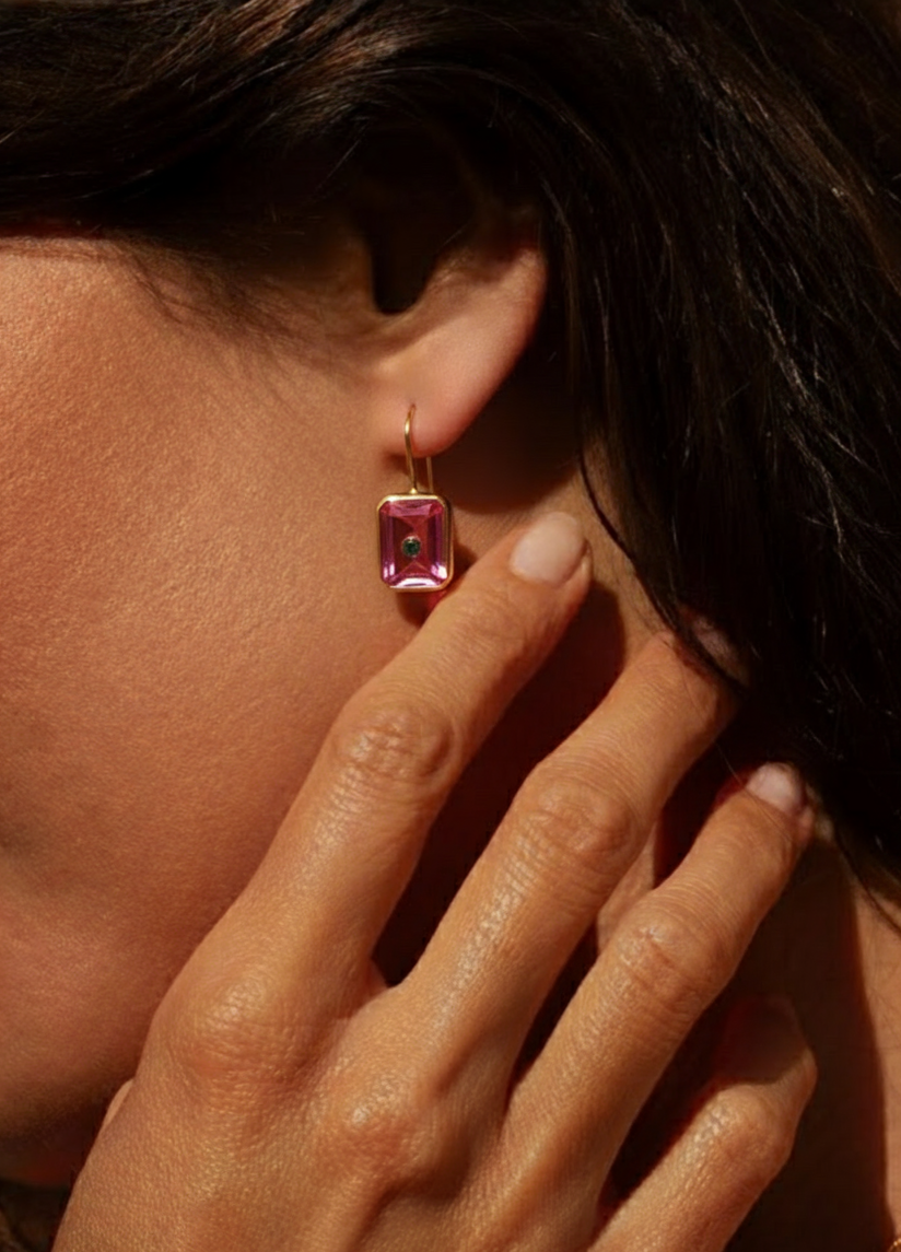 The Giselle Pink Hydro Earrings bring together clean geometry and rich colour in a silhouette that’s understated yet striking. It features a rectangular pink hydro gemstone accented with a contrasting dot of green onyx at its centre, creating a balance of symmetry and character. The polished gold frame adds a modern edge, letting the bold hues take focus.
