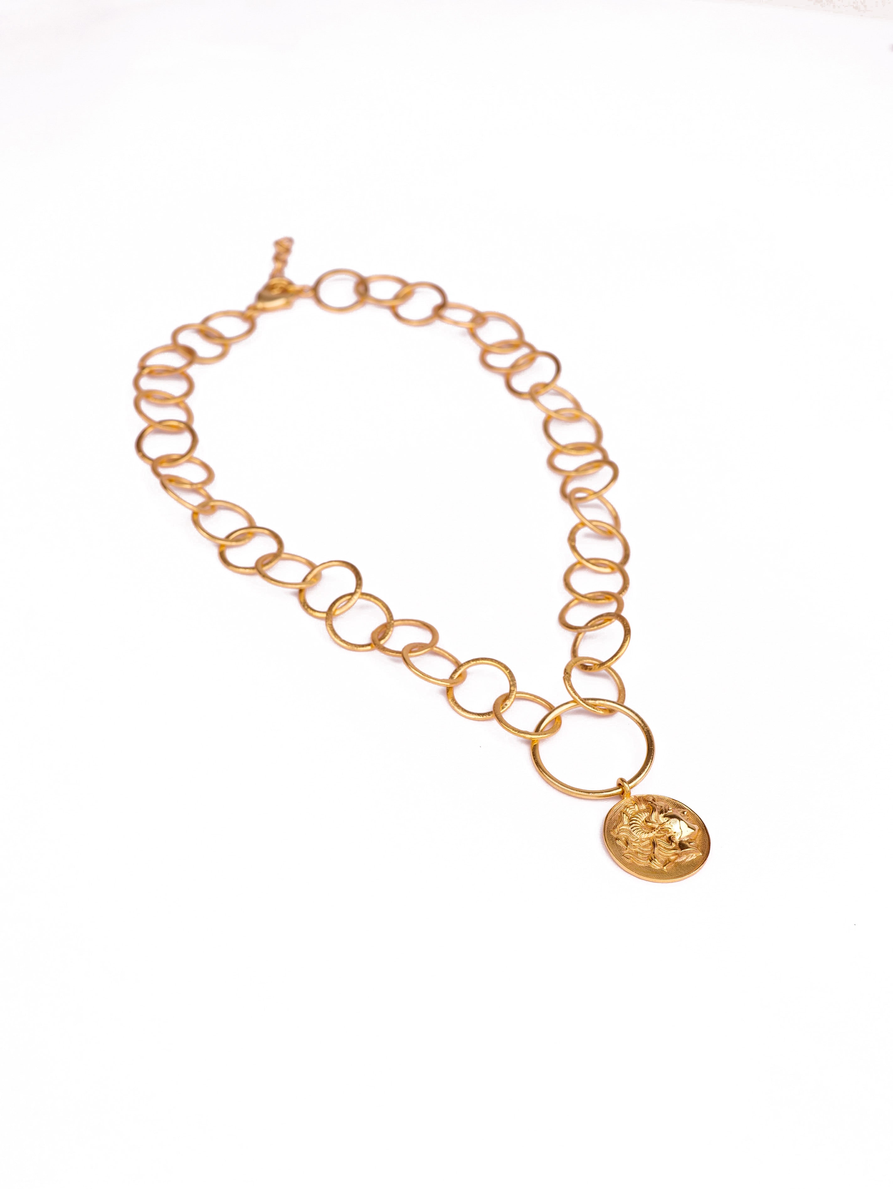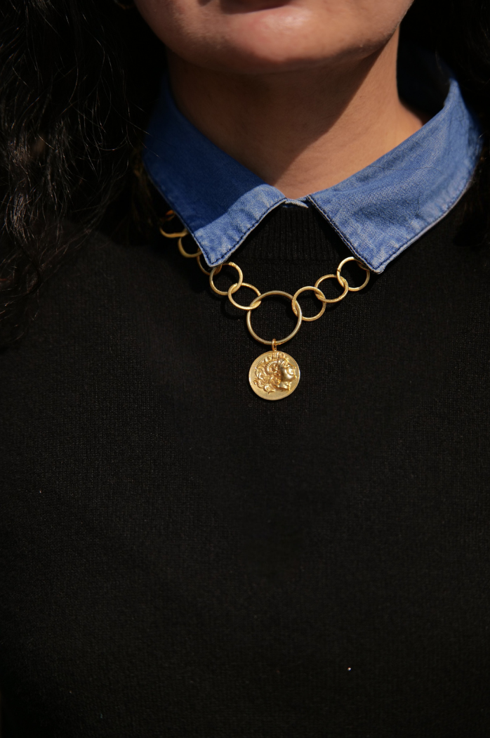 The Liora Medallion Chain blends bold form with timeless restraint. Crafted with interlinked gold loops and a sculpted medallion pendant, it brings a refined statement to any neckline. The oversized links give it a confident, modern feel while the coin detail nods to vintage European elegance. Wear it against crisp shirting or silk to add structure and shine. It’s contemporary, effortless, and quietly powerful.